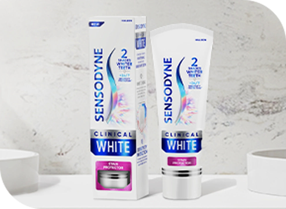 Pasta do zębów Sensodyne Clinical White Stain Protector to najbardziej zaawansowana technologia wybielania Sensodyne. Clinical White zawiera klinicznie sprawdzone składniki wybielające zęby, które usuwają przebarwienia, polerują zęby i zapobiegają powstawaniu przebarwień w przyszłości, zapewniając o 2 odcienie bielsze zęby*. Jednocześnie pasta chroni zęby przed nadwrażliwością** oraz zapewnia wszystkie korzyści codziennej pasty do zębów przeciw próchnicy. Ma również świetny smak i pozostawia świeży, miętowy oddech.