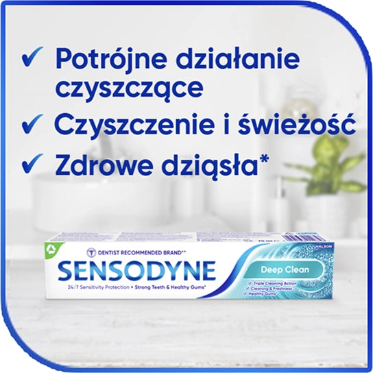 Jeśli podczas spożywania gorących, zimnych, słodkich i kwaśnych pokarmów, a nawet szczotkowania zębów odczuwasz krótki, przenikliwy ból, może to oznaczać, że Twoje zęby są nadwrażliwe. Pasta do zębów z fluorkiem Sensodyne Deep Clean do wrażliwych zębów została stworzona z myślą właśnie o Tobie, by zapewniać Twoim zębom odpowiednią pielęgnację i długotrwałą ochronę przed nadwrażliwością*. Formuła chroni zęby aż do 24 godzin* oraz oferuje wszystkie korzyści tradycyjnej pasty do zębów. Dzięki fluorkowi Sensodyne Deep Clean wzmacnia i utwardza szkliwo, zapobiegając jego uszkodzeniom. Ta pasta z fluorem gwarantuje także zaawansowane czyszczenie, co pomaga utrzymać właściwą higienę zębów i jamy ustnej, a odpowiednio dobrane składniki zapewniają długotrwałe uczucie świeżości. Przekonaj się, że Sensodyne Deep Clean to doskonały wybór dla Twoich zębów!